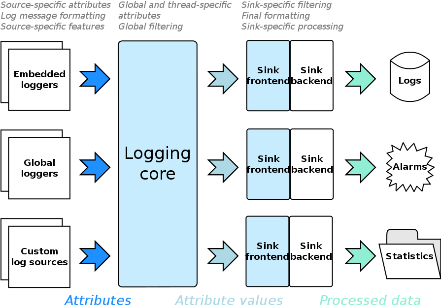 The logging core takes log records from the loggers, evaluates their attributes and begins to filter them. Examples of global filtering would include severity based filtering, or muting certain channels. Each record that survived the first filtering phase is filtered again, this time on a per-sink basis. Some attributes are only ever attached after filtering and can thus not be used while filtering.